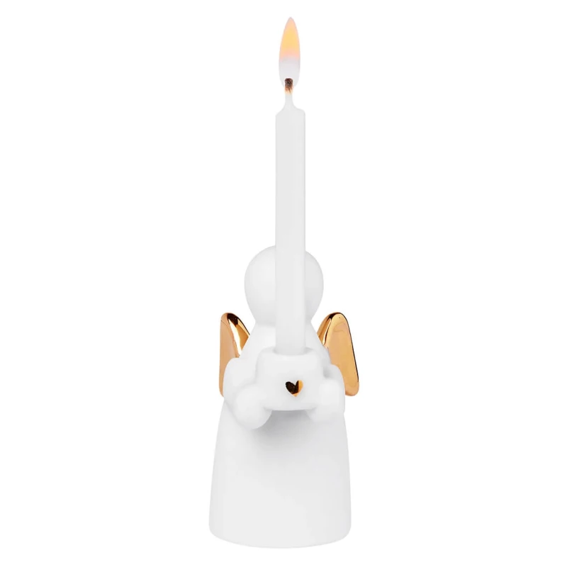 Het kleine engeltje van porselein in wit met goud, draagt een klein kaarsje en in het doosje zit nog een extra kaarsje. Een echt lichtpuntje om op te sturen naar iemand die het nodig heeft. Het is allemaal zo verfijn gemaakt door het Duitse merk Räder. Wij zijn echt fan!